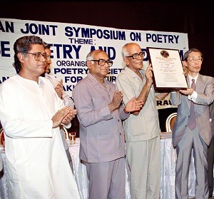 | 詩人は永遠を見る 「池田氏は、豊かな大衆に根ざす詩人、時代を若返らせる詩人、そして巨大なる詩人」「その声が聞けることは、世界にとって幸運です」と評したインドの詩人クリシュナ・スリニバス博士。池田先生が出会いをつづったエッセーを掲載する。〈『私の世界交友録』読売新聞社(『池田大作全集』第122巻所収)から〉 ![]() 1979年7月13日、スリニバス博士と対談する池田先生(神奈川文化会館で) 永遠が ここにある 限りなき「今」のなかに 晴れ晴れと輝く「今」のなかに 運命の凍結のなかに 憎しみの死滅のなかに (詩集『五大』の「火」から) インドの詩人クリシュナ・スリニバス博士の宿願は、「五大」すなわち宇宙をつくりあげている五つの要素「地水火風空」を謳い上げることであった。 「それが私の使命であり、それが終われば、私はもうどうなってもよい、と思っています」 博士の話しぶりには巧まざる韻律があった。声は正直である。博士の私心なきお人柄が、言葉の中身以上に声の抑揚に表れていた。 横浜の港のかなたに雄大な夏雲が隆起していた。一九七九年(昭和五十四年)七月。私は神奈川にいた。空は光にあふれ、海も耀い、人の世の不透明な相克を朗笑っているかのようであった。 その日盛りの午後、インドの港町マドラスからの賓客を迎えて、私は詩論を楽しんだ。マドラスは、その十八年前、私が「精神の大国」への第一歩をしるした忘れ得ぬ町である。あの喧騒。あの活力。それでいて、時の流れが変わったような、永劫感覚とでもいうべき、あの悠久の趣。 スリニバス博士は、この町を拠点に、世界五十カ国に読者をもつ英語の月刊詩誌『ポエット(詩人)』を一九六〇年から発行しておられる。世界詩歌協会の会長、国際詩人学会の会長を務め、この時の来日は、ソウルで開かれた第四回世界詩人会議の帰途であった。菜食主義者らしい、ほっそりとした長身である。 「偉大な詩人がいなくなりました」。博士が大息された。 「私は『ポエット』を通して、世界中の多くの詩を見ます。それらは『良い詩』であっても『偉大な詩』ではありません。かつて私は『埃りの舞い(Dance of dust)』という詩集を出版しました。今の詩は塵芥が舞っているようなものだ、しかし偉大な詩人が、いつかきっと現れる、という内容です」 博士の名を高めた、この詩集(一九四六年刊)は、T・S・エリオット、オーデン、スティーヴン・スペンダーら錚々たる詩人に絶賛された。 博士は言われる。 「真実の詩人は、宇宙、精神、真理などについて語る詩人です」「詩には常に呼びかけるもの(メッセージ)がなければなりません。また永遠性がなければなりません」 メッセージとは、「歌わずにいられない」何かをもっているかどうかということであろう。これを表現し終えれば死んでもいい、これを伝えなければ生きている甲斐がない――そういう炎が内に噴き上げているのが詩人である。 博士の炎が向かう焦点が詩集『五大』であった。私は申し上げた。 「五大は、わが生命でもあります。この一個の生命は大宇宙と同じく地水火風空からなる。すなわち五大は我即宇宙の哲学を表しています。この五大は妙法蓮華経の五字でもあります……」 ◆ ◆ ◆ 私は思う。詩人は永遠を見る人である。全身で永遠を感ずるゆえに、彼は諸行の無常を観ずる。諸物の止まらない流転が目に映るゆえに、この一瞬一瞬のかけがえなさを知る。 この「今」。充溢の「今」。生命にあふれた「今」を愛おしみ、詩人は歌わずにいられない。 詩人はいつも元初の地平に立っている。彼は毎朝、新しく誕生する。彼には毎日が始まりの日である。「久遠の子ども」の汚れない瞳で詩人は世界を見る。 すると日常は何と美しいことだろう。 葉裏に透ける陽の光――何という奇跡! 窓ガラスをすべる銀の雨粒――何という宝石! 詩人は宇宙の法則の探究者であり、万象を黄金の大生命の表れと見る。ゆえに彼は常に「ほめたたえる人」である。 詩人は、平凡な日常にも、不滅の生命が浸透していることを知っている。だから彼は、ものの価値を機能で見ない。「それが私の何の役に立つか?」でなく、「その命は光っているか?」を、それ自身のために思いやる。消費文明の市場価値でなく、心による価値が彼の基準である。一枚の粗末な紙でも、心がこもっていれば、億万の紙幣より彼は大切にする。 科学は「だれでも代わりになれる」と突き放し、詩は「君でなければならない」と呼びかける。 詩人は戦う人である。 彼は人間の運命に責任を感じる。彼は、世界のどこかで非人間的に扱われる人間がいることを容認できない。一人の人間こそ全宇宙という織り物を結びつける結び目であり、どの一人なくしても宇宙は完全ではないことを彼は感じている。 だから――私は博士に語った。 「現実に埋没した社会にあって、詩は心の窓を開けます。その窓から、さわやかな生命の涼風が吹きこんできます。詩は人間性の証であり、崇高