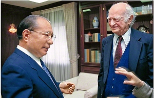 | 知性ある人は行動する 「現代化学の父」と呼ばれる科学者ライナス・ポーリング博士。池田先生との語らいの折、「世界の青年は平和のために努力を。人類の得た富が、軍備のために流用されていくことを防ぐことほど重要なことはない」と語った。先生が博士についてつづったエッセーを抜粋して掲載する。〈『虹の調べ』第三文明社(『池田大作全集』第120巻所収)から〉 ![]() ライナス・ポーリング博士㊨と池田先生が会見(1990年2月21日、創価大学ロサンゼルス分校〈当時〉で) “現代化学の父”と言われるライナス・ポーリング博士。これまでノーベル化学賞と平和賞を受賞されている。異なった分野で、単独で二つのノーベル賞を受けたのは、博士だけである。 一九九四年、九十三歳で逝去されるまで、平和のため、科学のため、探求と行動をたゆみなく続けられた。わが創価大学の名誉博士として、「創価教育」に全幅の信頼を寄せてくださった。アメリカ創価大学(ロサンゼルス)にも、サンフランシスコの自宅から、遠路をいとわず、何度も足を運んでくださった。「平和のため、教育のため、人類のためなら何でもします」――と。博士は、私との対談集の中で、ご自分の人生についても率直に語ってくださった。 自身の生涯に決定的な影響を与えた四人の師匠を、博士は挙げておられたが、その一人は、博士の夫人であった。対談集の随所に、亡くなったエヴァ夫人への、深き「愛情」と「尊敬」の念がにじみ出ている。博士は、しみじみと語っておられる。 「私へのおほめの言葉は、妻が受ける資格があるのです。なにしろ、長い間、世界平和のために私が働くよう、鼓舞し、励ましてくれたのは妻ですから」と。 平和への“戦友”であり、“同志”であった博士と夫人との、美しくも尊き心の絆が伝わってくる一言である。 ◇ ◇ ◇ 七十七歳で亡くなるまで、夫人は四人の子どもの良き母であり、十五人の孫の良きおばあちゃんであった。三人の曾孫にも、深い愛情を注がれていた。 エヴァ夫人は、大学では栄養学を学んでおり、あまり丈夫でなかった博士のために、ずいぶん食べものの工夫を重ねて、博士の健康を支えたという。私が、ポーリング博士に「お好きな食べものは」とうかがったところ、博士は、真っ先に、奥さま手づくりのサワークリームのケーキを挙げておられた。 そうした家庭的な側面とともに、夫人は、信念を貫く「強き人」「賢き人」、そして「負けない人」であった。ポーリング博士は、こんなエピソードを、淡々と語ってくださった。 ――それは日本とアメリカの戦争中の話である。 ある人からエヴァ夫人に、日系人の青年を庭師として雇ってほしいという依頼があった。戦時中で、失業も多かった時代のことである。「個人の人権」を何よりも大切に考えていた夫人は、青年が日系人であることに関係なく、依頼に快く応じた。 ところが、その晩、ポーリング家のガレージには「アメリカ人が死んでいるのに、ポーリングは“日本人”を大切にしている」といった落書きが、ペンキで大きく書かれたのである。この事件は、新聞にも報じられ、博士夫妻には脅迫の手紙も何通か送られている。ずいぶん悪評も立てられたようである。しかし、それでも博士と夫人は、その日系人の青年を保護し続けたのである。「心配しなくていいんだよ」「人間には生き抜く権利があるのだから」と――。このように博士夫妻には、万事に一貫した、さわやかな信念の行動があった。 戦時中、ポーリング博士夫妻は、長男を戦場に送っている。そうした経験をもつ母親としての思いもこめ、エヴァ夫人は、戦後、夫と共に平和への行動を開始する。「息子を苦しめた戦争を二度と起こしてはならない」「平和のために戦おう」と決意し、核兵器廃絶への活動に立ち上がる。 「核の力」に対する「精神の力」の戦い――。夫妻は健気にも、二人三脚で新しい使命の道を歩み始めたのである。しかし、尊き無償の行動を続ける夫妻に、さまざまな理不尽な圧迫が加えられた。 一九五〇年から数年間、アメリカでは、マッカーシー旋風(マッカーシー上院議員らによる、共産主義をはじめとする思想・言論への弾圧)が、暴風雨のように吹き荒れた。 そのなかで、ポーリング博士は何回も取り調べを受け、外国にも行けないように、パスポートの発行も拒否された。また大学でも学科長の職を解任され、給与も減額。さらに、研究室を明け渡すよう迫られたのである。 こうしたなかにあって、なぜ博士が正義の信念を貫き通すことができたのか。博士は言われた。「(核兵器反対の立場をとるという)決断をうながす決め手となったのは、妻から変わらぬ尊敬を受けたいという私の願いでした」と――。 夫妻は、平和への強い“同志愛”で結ばれていたのである。 博士の闘争には、悲壮感がなかった。こんなエピソードもある。 ある日、博士はご夫妻で、核実験の再開に反対する婦人団体のデモに参加され